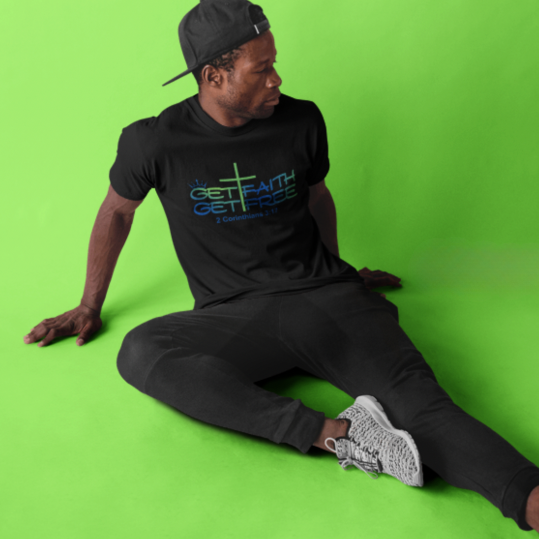 "Rep with style and humor in our machine washable 'Get Faith, Get Free' t-shirt! Available in sizes up to 4x and made with soft cotton, this hot item is perfect for representing your walk with the big homie. Inspired by 2 Corinthians 3:17. #Blessed"